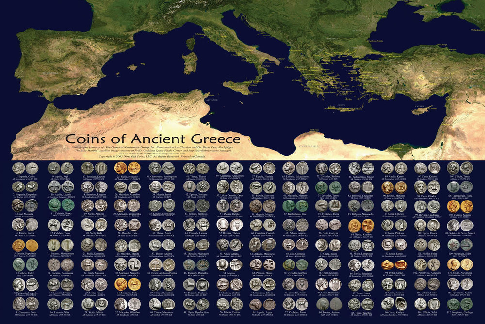 Our largest poster! This gorgeous 36"x24" (91.4x61cm) features a coin from every major Greek region over a NASA map of the Mediterranean with labels of the mint locations.